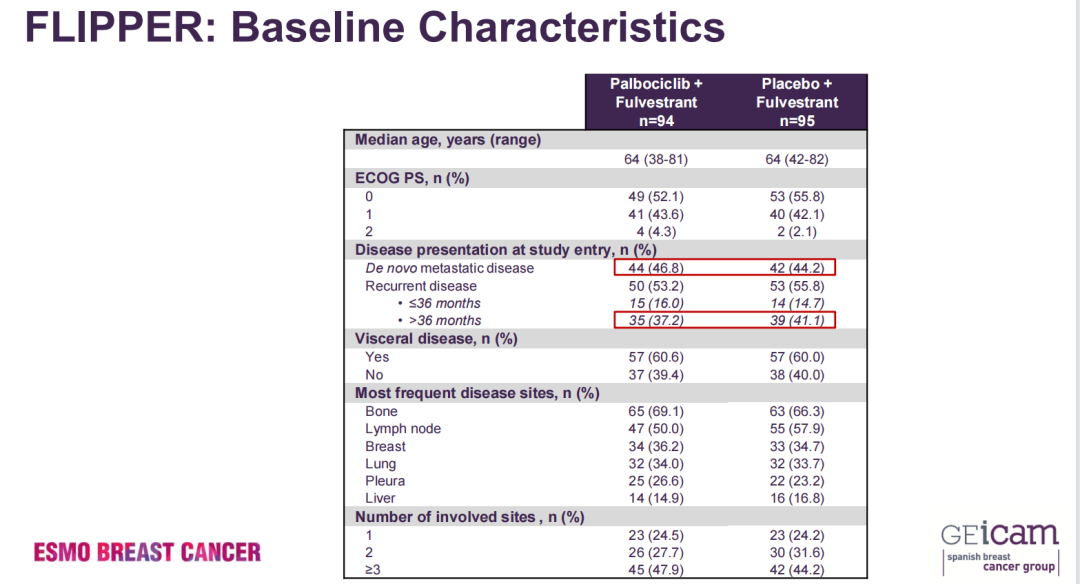 FLIPPER研究将患者按照1:1比例随机分两组,其中FUL / PAL组94例患者,FUL / PBO组95例患者。60.3%的患者存在内脏转移。主要研究终点,1年PFS率。分层因素包括:内脏vs非内脏、复发性疾病vs初诊转移性疾病。次要终点包括中位PFS、OS、客观缓解率(ORR)和安全性等。该研究达到了预先设定的主要终点:FUL / PBO和FUL / PAL组的1年PFS率分别为83.5%和71.9%(HR=0.55;80%CI:0.36~0.83,P=0.064),中位PFS分别为31.8个月和22.0个月(HR=0.52;95%CI:0.34~0.78;P=0.002),ORR分别为68.3%和42.2%(P=0.004)。